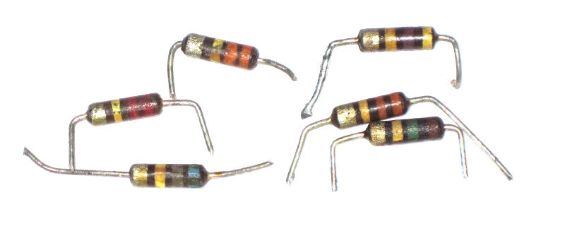 | Das folgende Bild zeigt einige defekte Widerstände aus den Geräten Stereo 1, Studio A und Freudenstadt FD 16. Betroffen sind insbesondere die Widerstände an den Magischen Bändern: Im Stereo 1 R318 am EMM803. Der Widerstand befindet sich zudem auf der HF-Platine (linke Platine von unten gesehen) und ist von oben nicht zu erreichen. Deshalb wurde der Ersatz-Widerstand unter die Platine gelötet (letztes Bild, Bildmitte). |